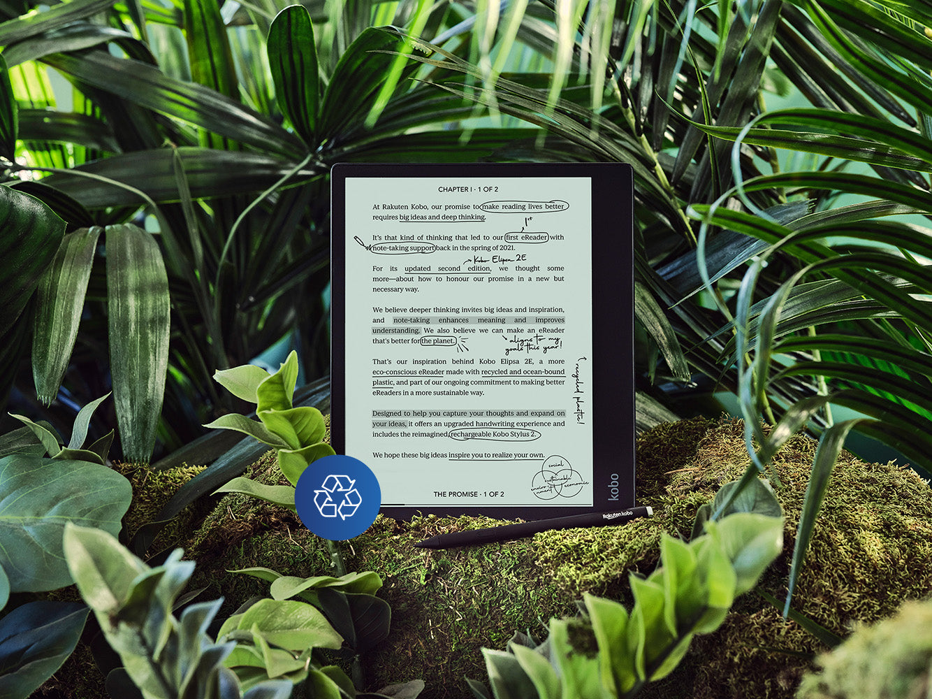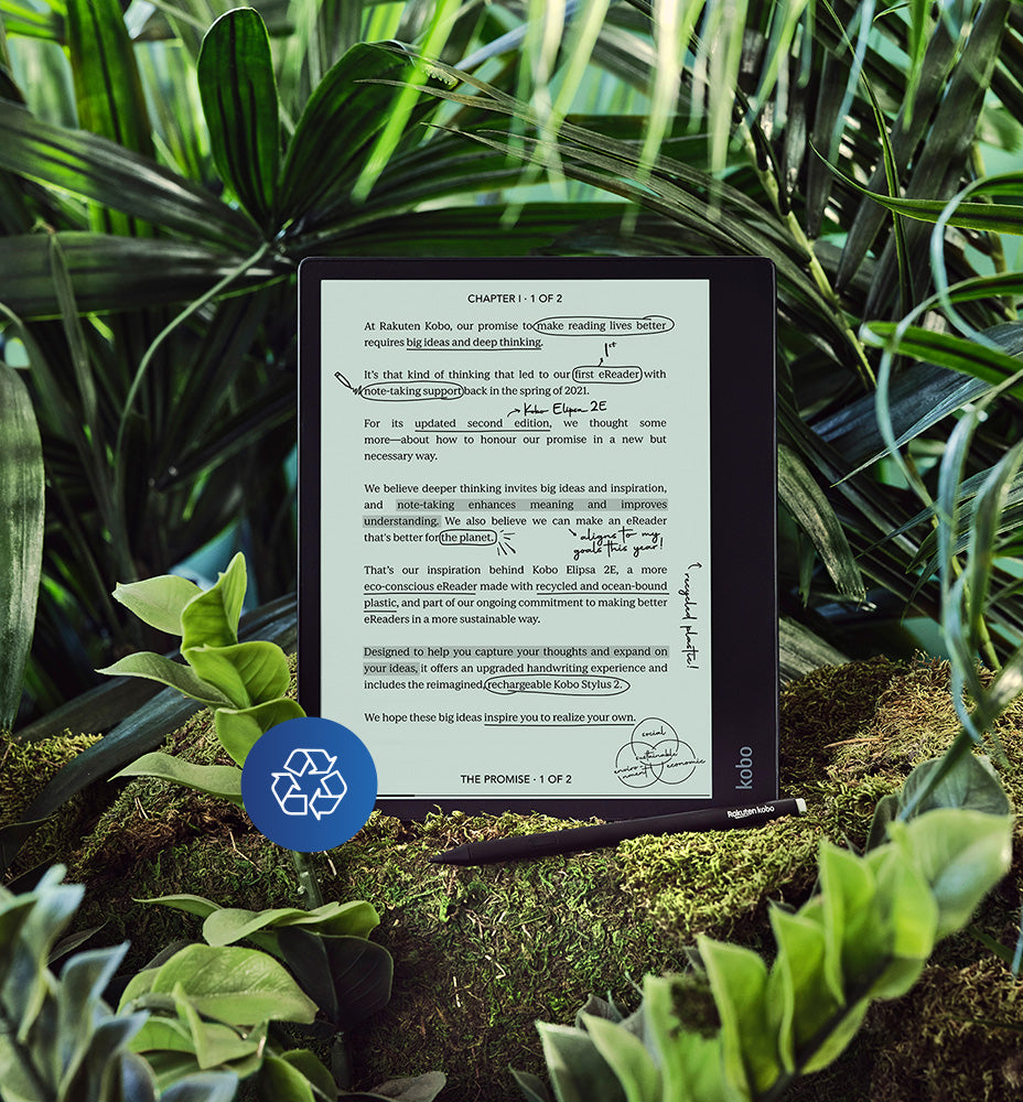 As part of our commitment to using more sustainable materials in Kobo eReaders, Kobo Elipsa 2E is made with recycled and ocean-bound plastic, and recycled magnesium alloy. Its packaging is also more sustainable. Learn more at kobo.com/eco
